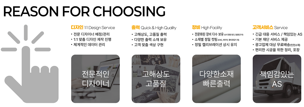 앞으로 출력하라는 단순한 제작 회사를 넘어 출력, 디자인, 제작, 시공 등 다양한 분야가 서로 연결되는 더 나은 제작 환경과 협력 구조를 만들어가고자 합니다.
